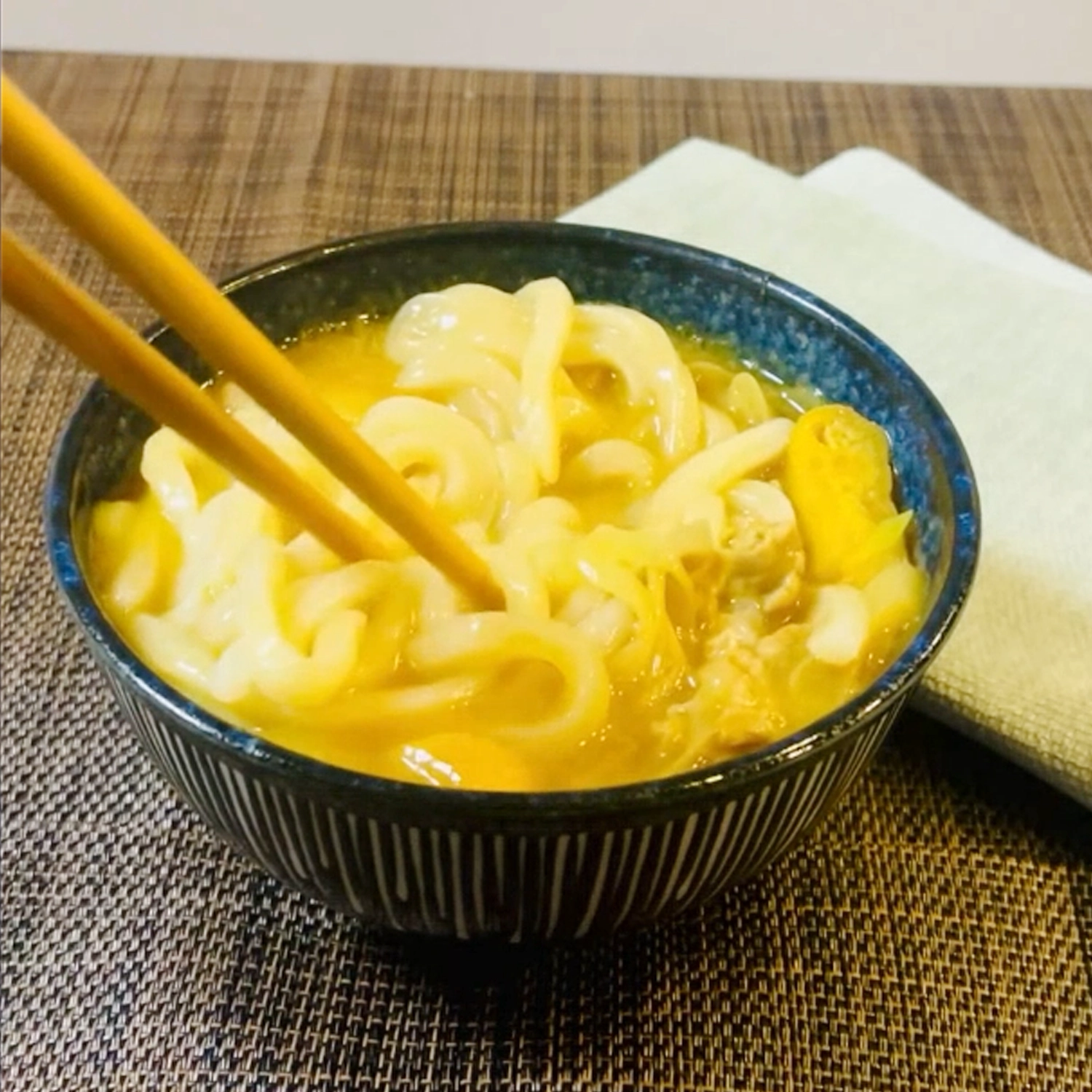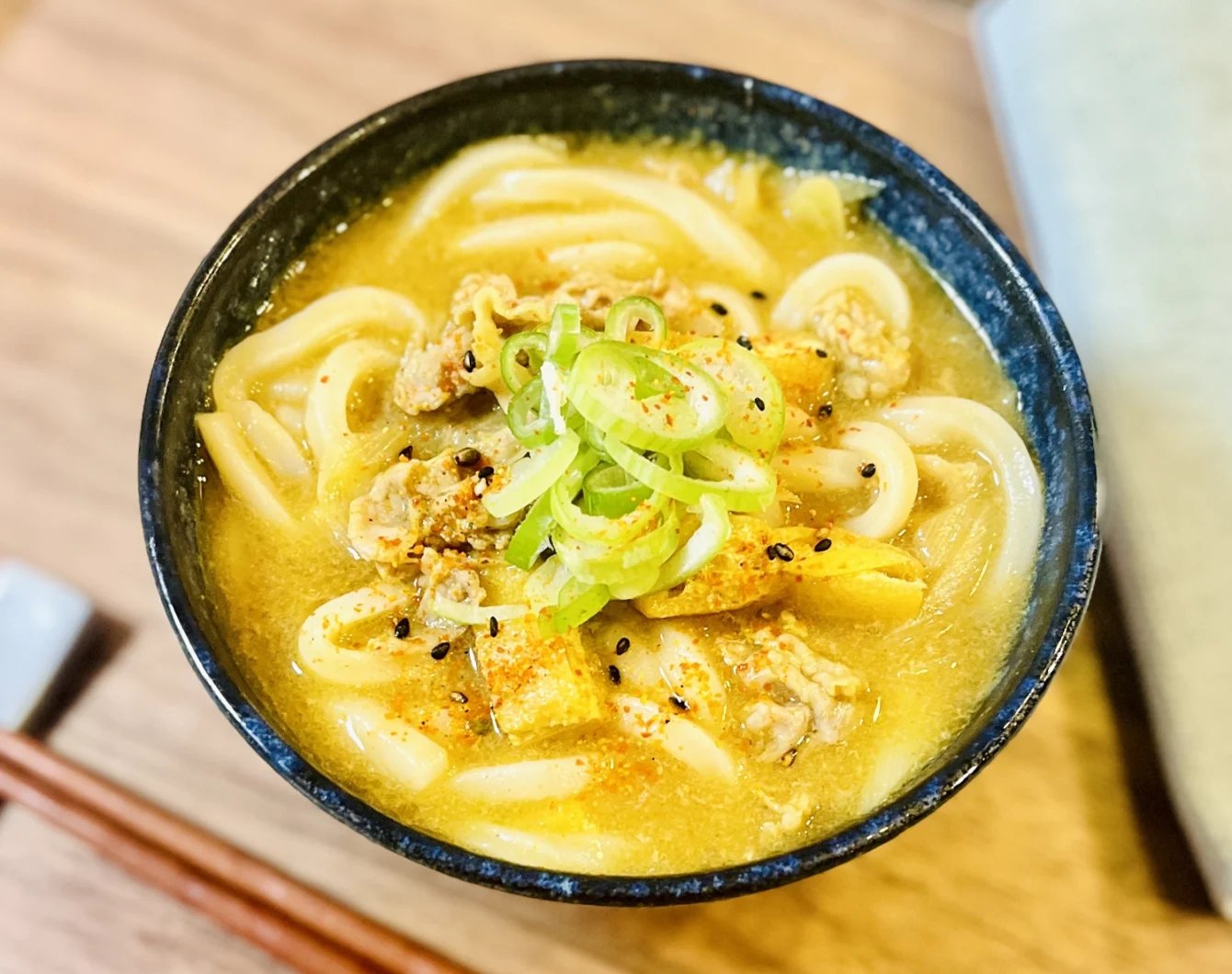 うどんを入れてよく混ぜ、 お好みで七味や青ネギをのせて出来上がり。