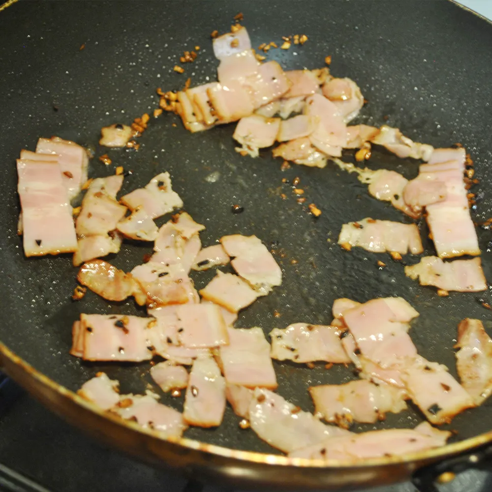 にんにくの香りが立ってきたら ベーコンを加え炒めた後、 火を止めて【A】を加えて混ぜる。