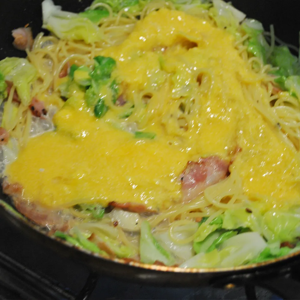 ②に茹で上がったパスタと【ソース】を入れて、 中火にかけながら混ぜたら出来上がり。
